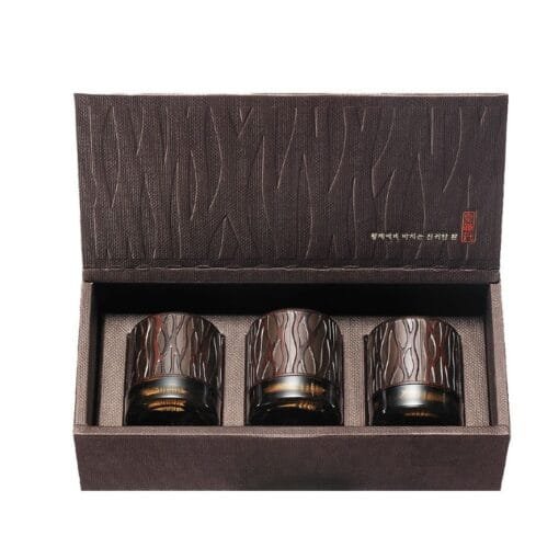 Bột Hồng sâm Hàn Quốc (Thiên sâm) 6 năm tuổi 34%, Bột Tinh chất chiết xuất Hồng sâm Hàn Quốc (Thiên sâm) 6 năm tuổi 2%, Bột Nấm thượng hoàng, Bột chiết xuất nhung hươu, Chiết xuất Đương quy Hàn Quốc, Bột đậu nành, Glycerin, Bột chiết xuất quả Sơn thù du , Bột chiết xuất Nấm kim châm & Dextrin, Bột Địa hoàng, Mật ong, Hương vị thảo dược tự nhiên.